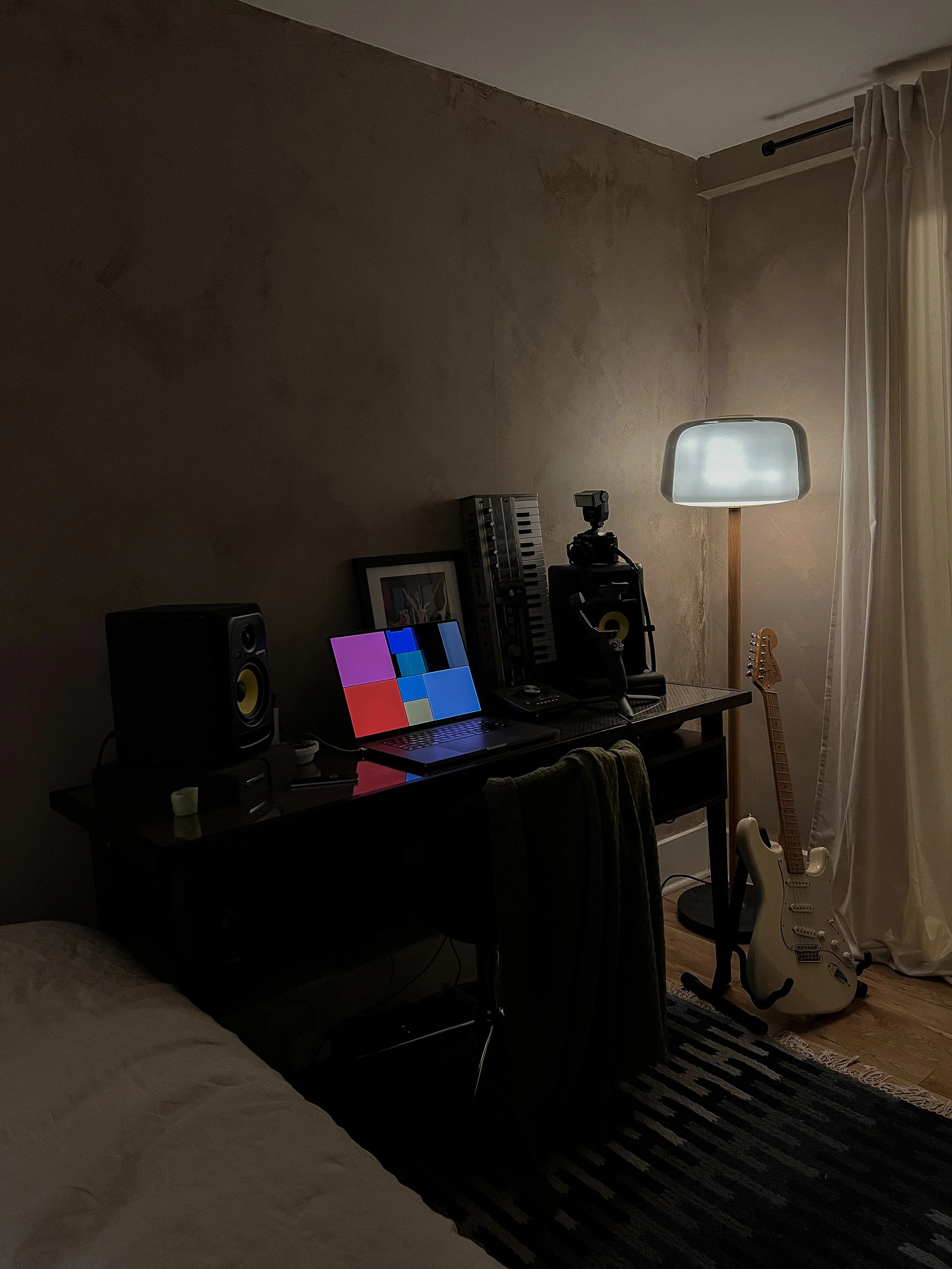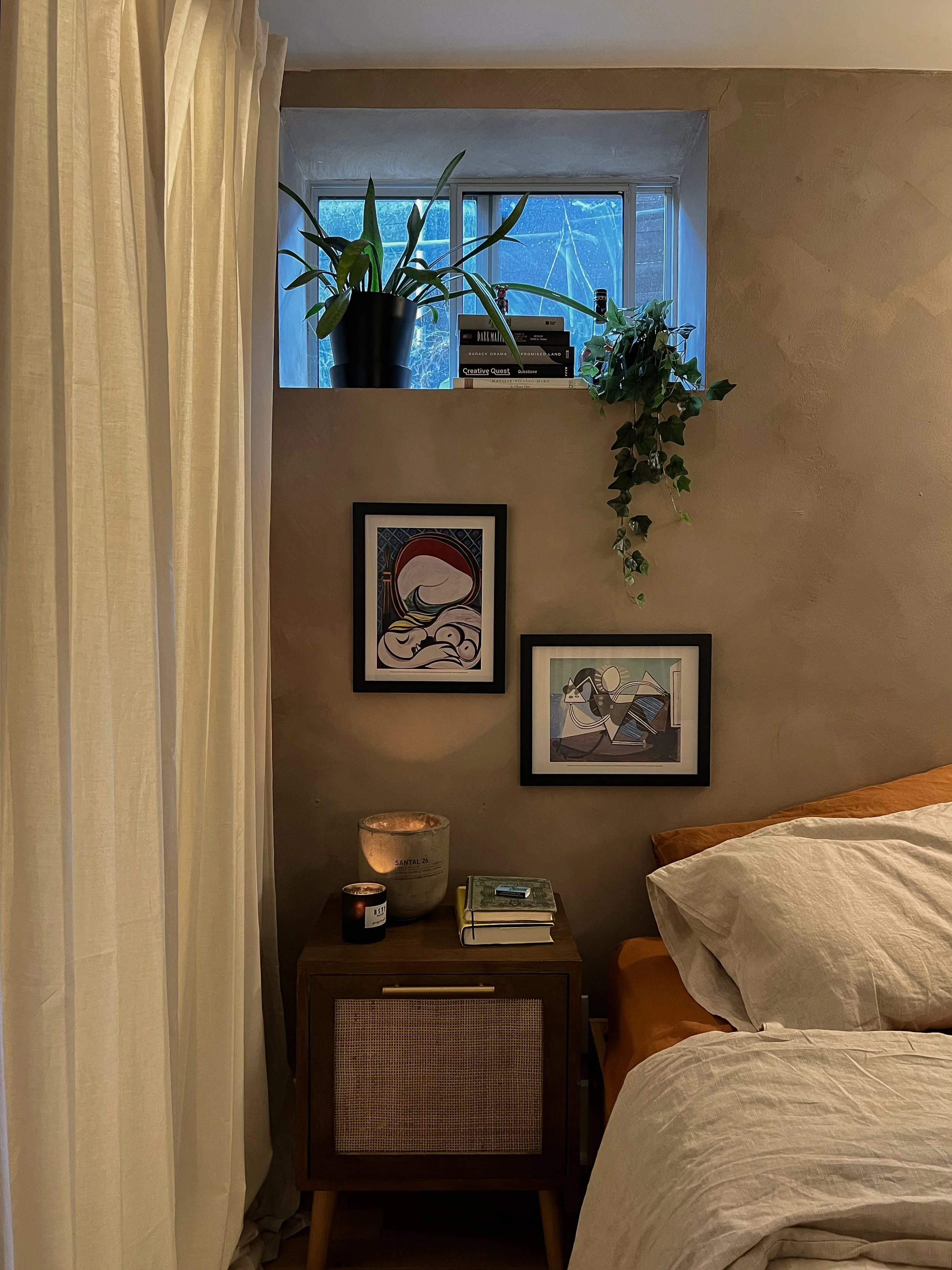 We transformed this tiny basement bedroom into a cozy and creative oasis. Our client wanted it to feel moody and cave-like, while also carving out space to work on music. All furniture was sourced secondhand.